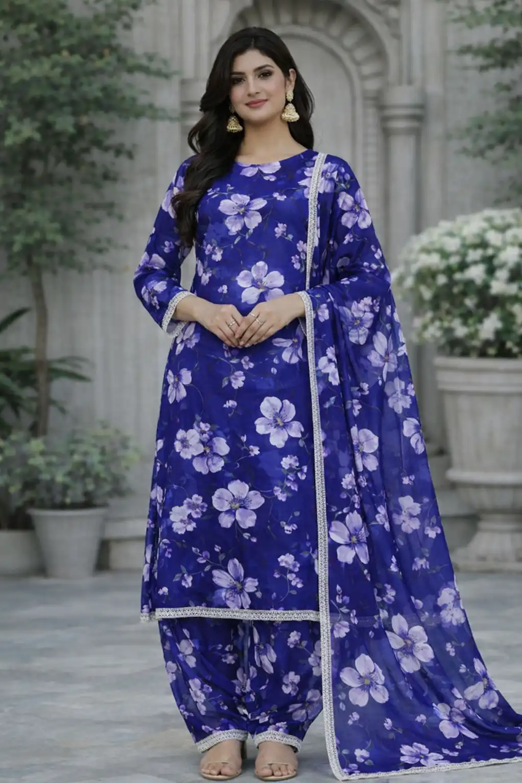 3 piece lawn suit with chiffon deep blue floral design