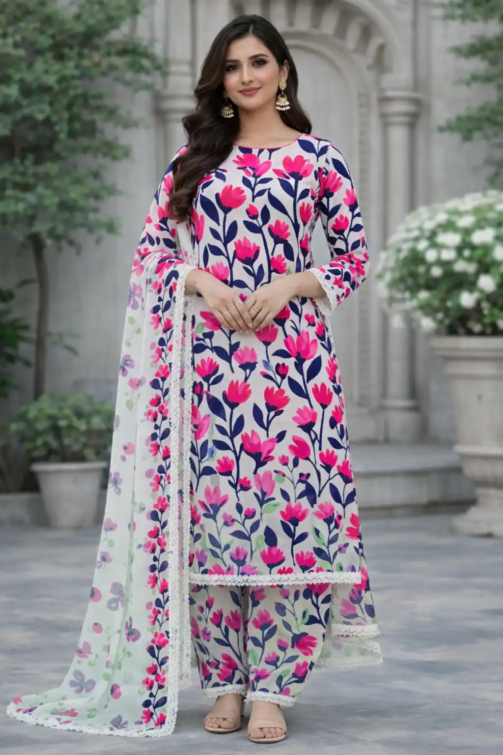 3 piece lawn suit with chiffon dupatta bright pink and dark blue floral design