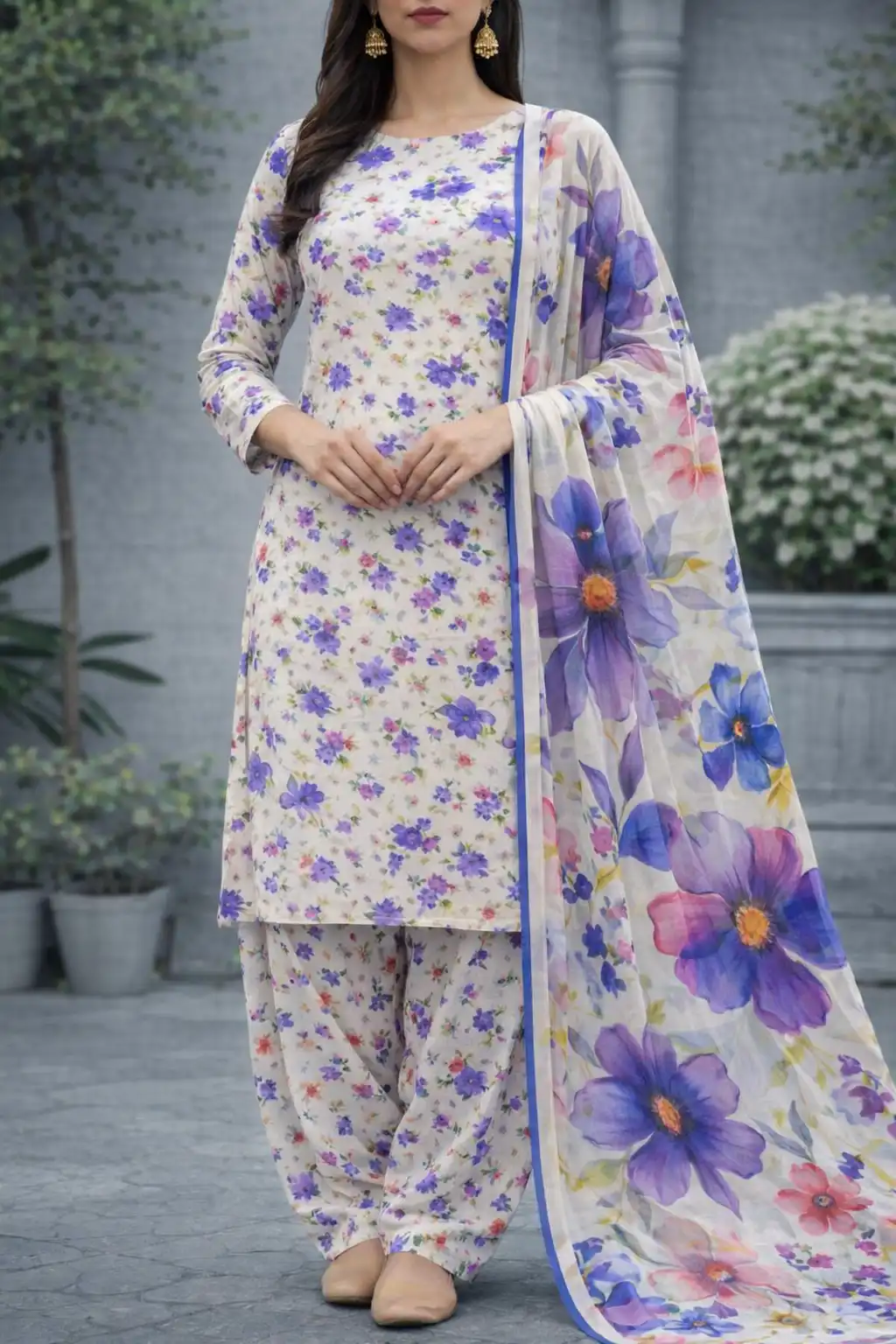 3 piece lawn suit with chiffon dupatta purple‑pink floral fabric