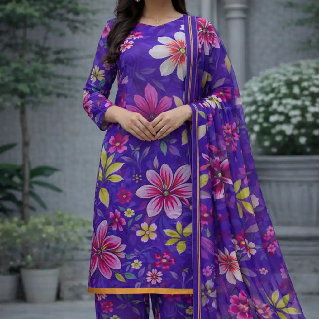 3 piece lawn suit with chiffon dupatta purple floral fabric