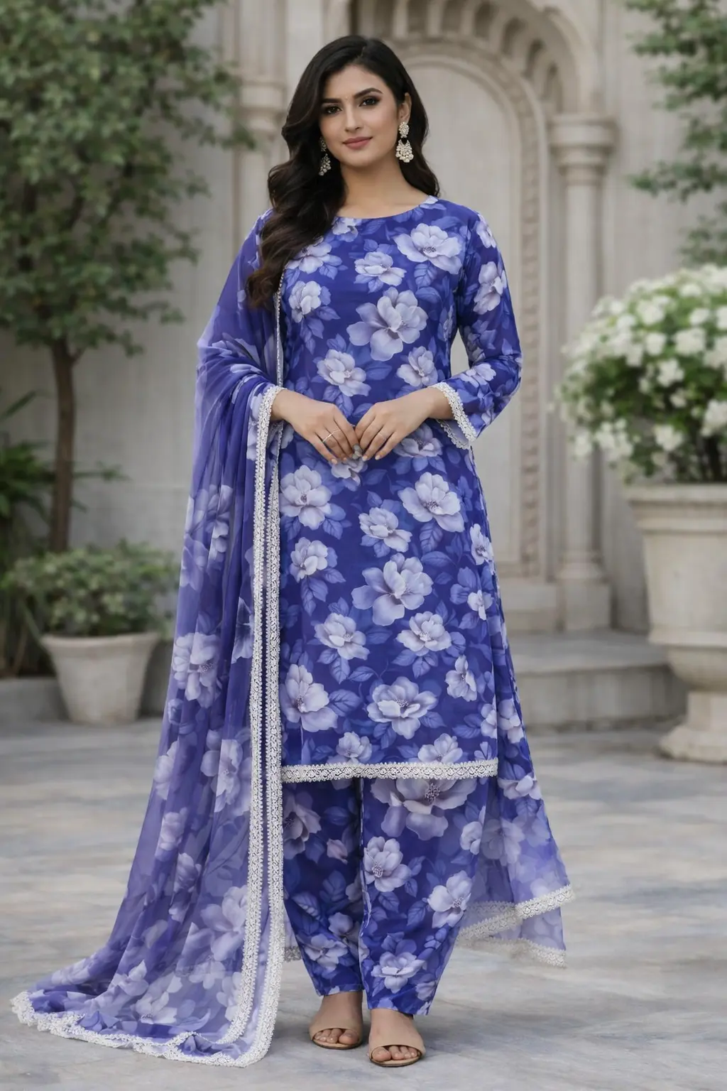 3 piece lawn suit with chiffon dupatta white and light purple floral design3 piece lawn suit with chiffon dupatta white and light purple floral design