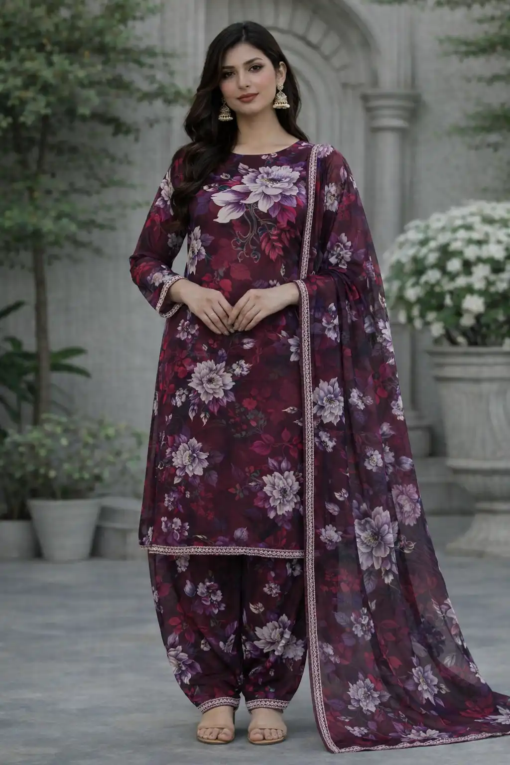 3 piece lawn suit with chiffon rich maroon and purple floral