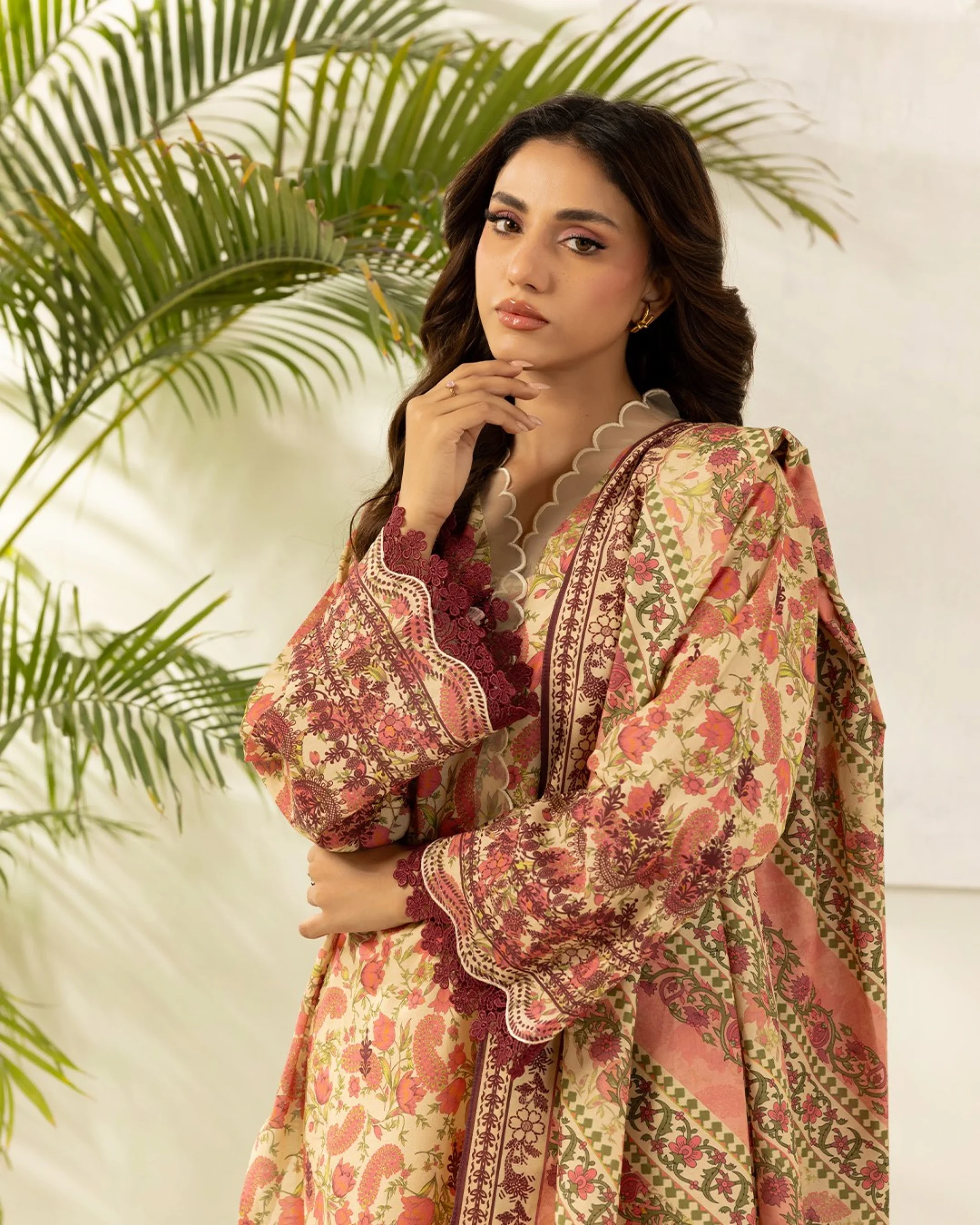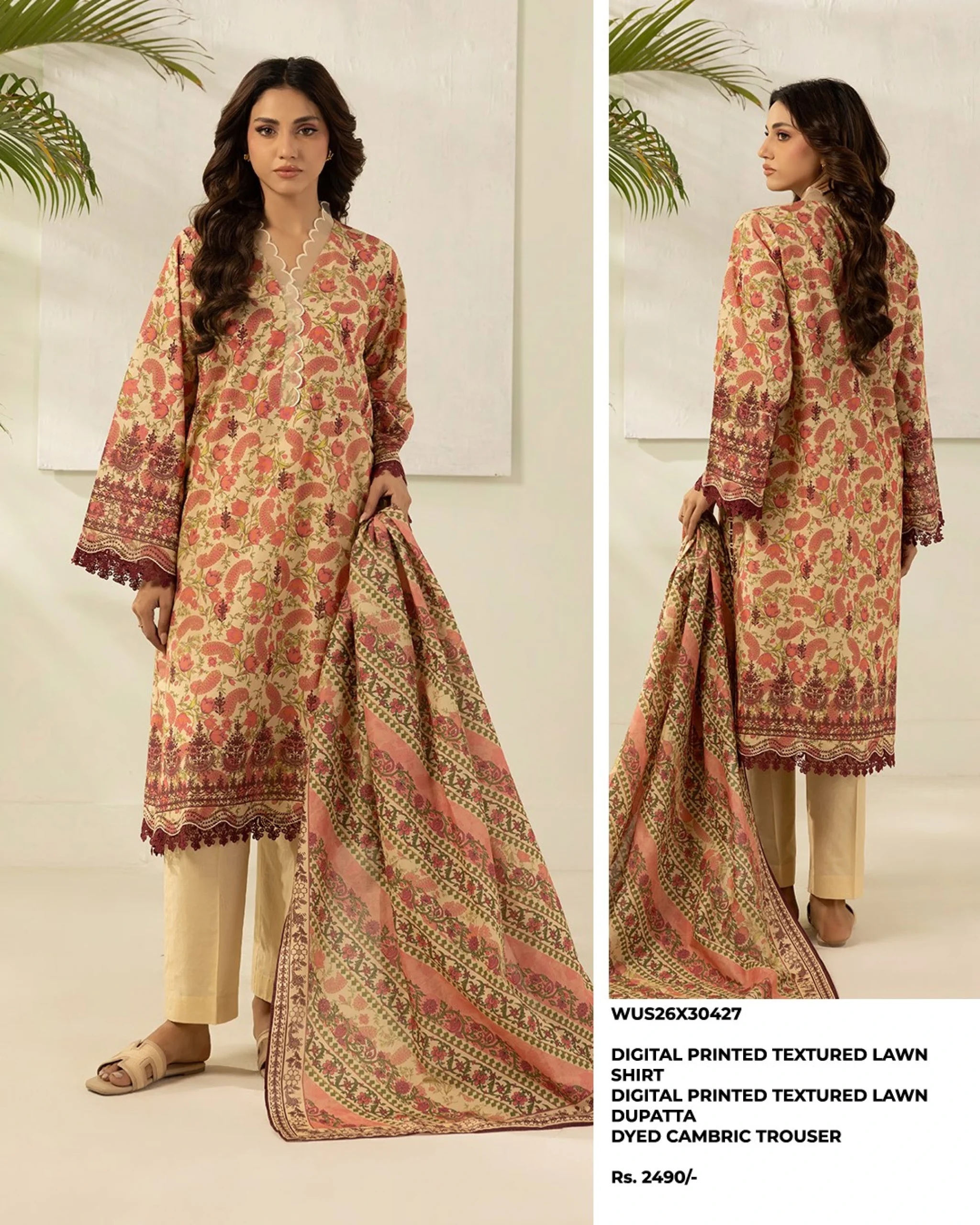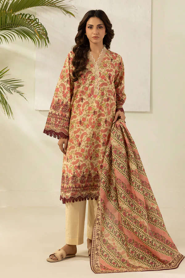 Buy 3 Piece Printed Lawn Shirt Shalwar Dupatta in Beige Color
